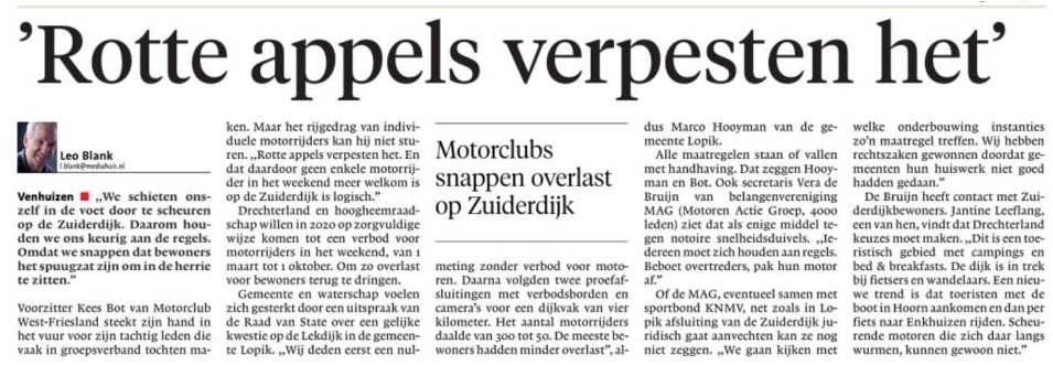 Gemeentebelangen Drechterland heeft al begin 2018 een motie ingediend om de overlast van verkeer (hoofdzakelijk motoren) te beperken voor de inwoners aan de dijk. Deze motie werd toen door de coalitie weggestemd, maar blijkbaar is het college toch tot inkeer gekomen en konden ze niet meer onder de klachten van de inwoners uitkomen. GBD is heel blij met deze stap en we hopen dat de proef een succes wordt. Wij bijven dit onderwerp scherp in de gaten houden.